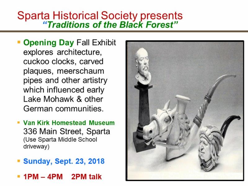 “Traditions from the Black Forest” will open at the Sparta Historical Society’s Van Kirk Homestead Museum on Sunday from 1:00 - 4:00 pm with 2:00 pm talk. This fall exhibit pays homage to the cultural influences from the Black Forest of Germany and Austria. “Traditions from the Black Forest” explores architecture, cuckoo clocks, meerschaum pipes, magnificent carved plaques and other traditional artistry seen in the early days of Lake Mohawk and other local German communities throughout the Sussex County area. This exhibit includes artifacts from our own collection as well as local collectors. The Bruce Museum, Greenwich, CT also contributed their intricately carved meerschaum pipes for display.The Sparta Historical Society is located at The Van Kirk Homestead Museum at 336 Main Street (Rte. 517, use Middle School Driveway), Sparta, NJ. Our fall exhibition, “Traditions from the Black Forest” will also be shown Sunday, October 7, 14, and 28 as well as Sunday, November 11 and 25 with closing date of Sunday, December 9 from 1:00 - 4:00 pm with 2:00 pm talk. For more information, call 973-726-0883, email spartahistoricalsocnj@gmail.com or visit www.vankirkmuseum.org.