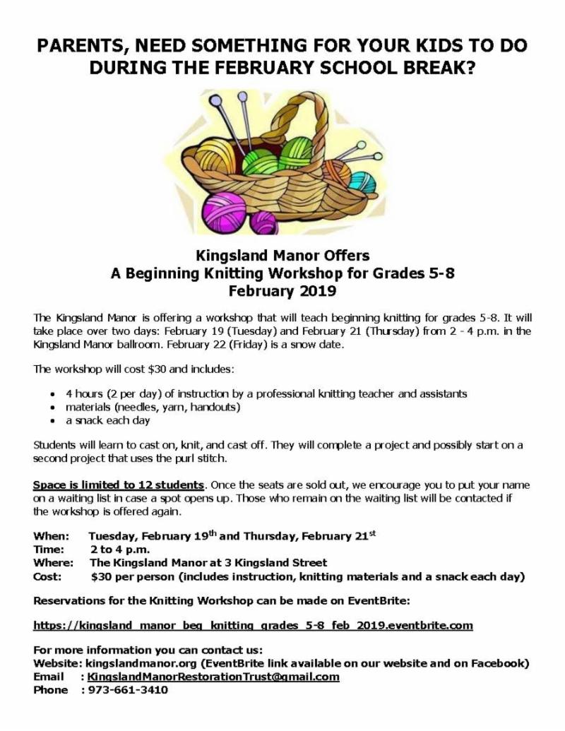 Essex County - Nutley - Beginning Knitting Workshop for Grades 5 - 8 @ Kingsland Manor