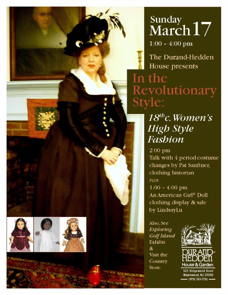 Join Durand-Hedden for this wonderful event for mothers, daughters, fashionistas, home sewers, history lovers, and all those who wonder how clothing provides a window into the past. At 2:00 pm, clothing historian Pat Sanftner will reveal the high style changes that took place in the 1700s in Europe and then the American Colonies, and the fashion mavens who made them, using 100 illustrations to demonstrate four significant style changes during the time period.