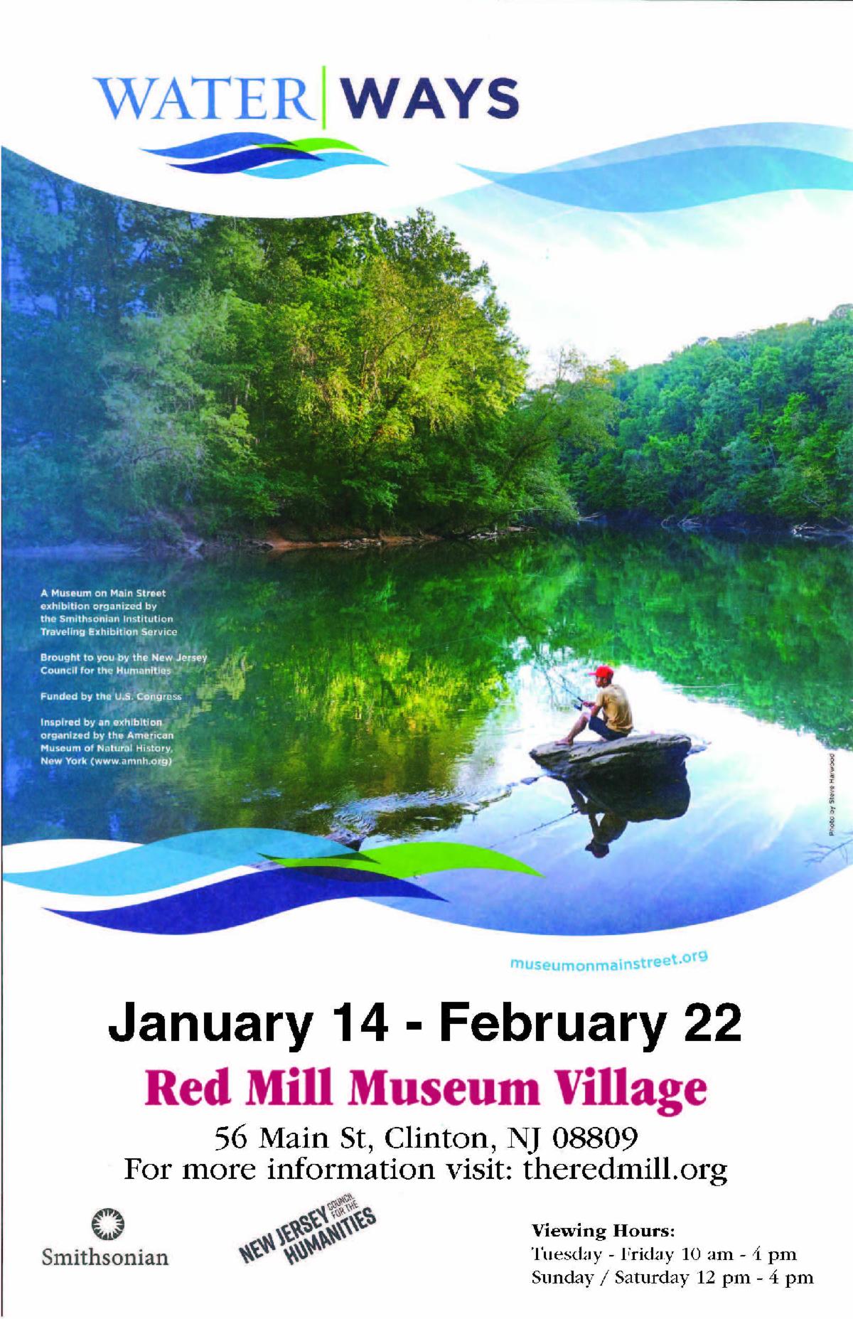 Water/Ways, an exhibition from the Smithsonian’s Museum on Main Street, explores the relationship between people and water. It explores the centrality of water in our lives including its effect on the environment and climate, its practical role in agriculture and economic planning, and its impact on culture and spirituality. Water/Ways is part of Museum on Main Street, a unique collaboration between the Smithsonian Institution Traveling Exhibition Service (SITES), state humanities councils across the nation, and local host institutions. To learn more visit www.museumonmainstreet.org. Guided tour of the exhibit will be available every weekend during the run of the exhibit! On January 30th, at 5:30pm join us for a special reception, with exhibit lecture by Tom Belton of the Patrick Center for Environmental Research, Academy of Natural Sciences of Drexel University. Food and refreshments will be served. The Red Mill Museum Village |